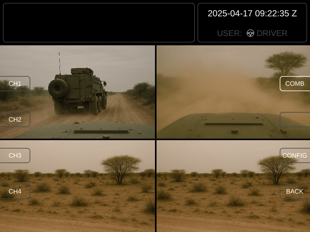 Additionally, the HUMS GUI has been customised for use cases that receive video streams across PAL or Ethernet to allow for visual monitoring and situational awareness. These views are system dependent and fully customisable per specific client requirements such as individual camera, panoramic, or birds-eye view to name a few.