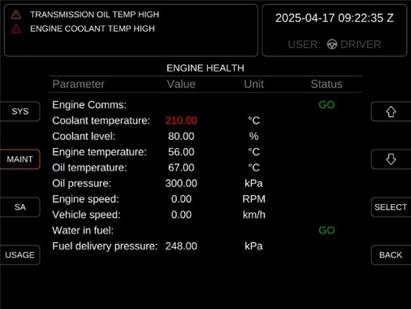The software platform is suited to perform onboard diagnostics and data logging. This enables users to detect system faults such as excess vibration, abnormal temperatures, loss of communication, to name only a few. These faults are displayed immediately with colour-graded scales for priority identification. They are grouped according to systems such as Engine, Transmission, and other vehicle-specific sub-systems. Each fault reports various details such as system of origin, time, and actionable steps to mitigate risk.