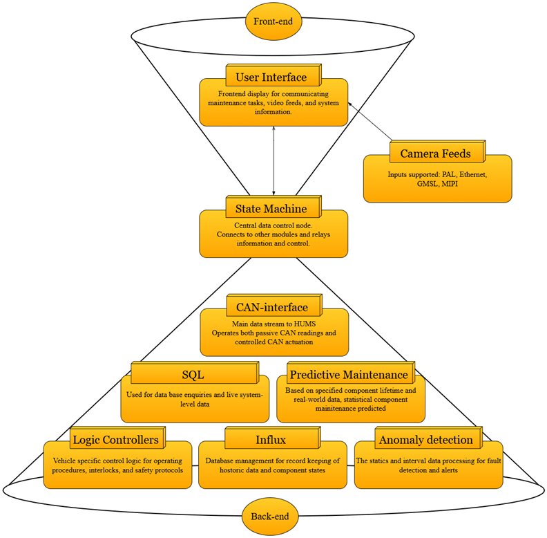 The purpose of a vehicle HUMS is to provide actionable maintenance task alerts with various layers of detection mechanisms. The first layer is to keep track of vehicle parts according to their serial number and track usage time per component. Upon a component reaching its user defined maintenance interval (or end-of-life) the operator is informed via the GUI. It is then the operator and maintenance team’s responsibility to either replace the component or do the required maintenance tasks, such as filter and oil changes. The maintenance activities are then captured on the HUMS database, and serial numbers of replaced items are updated accordingly.